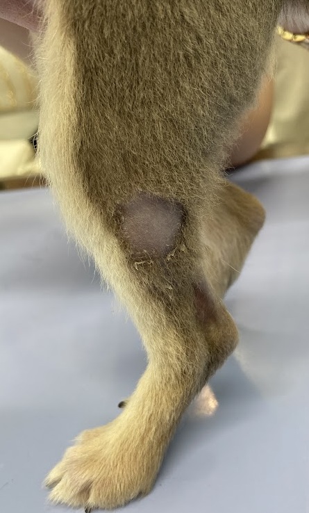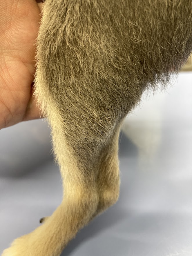 左後ろ足のひざ下の外側。