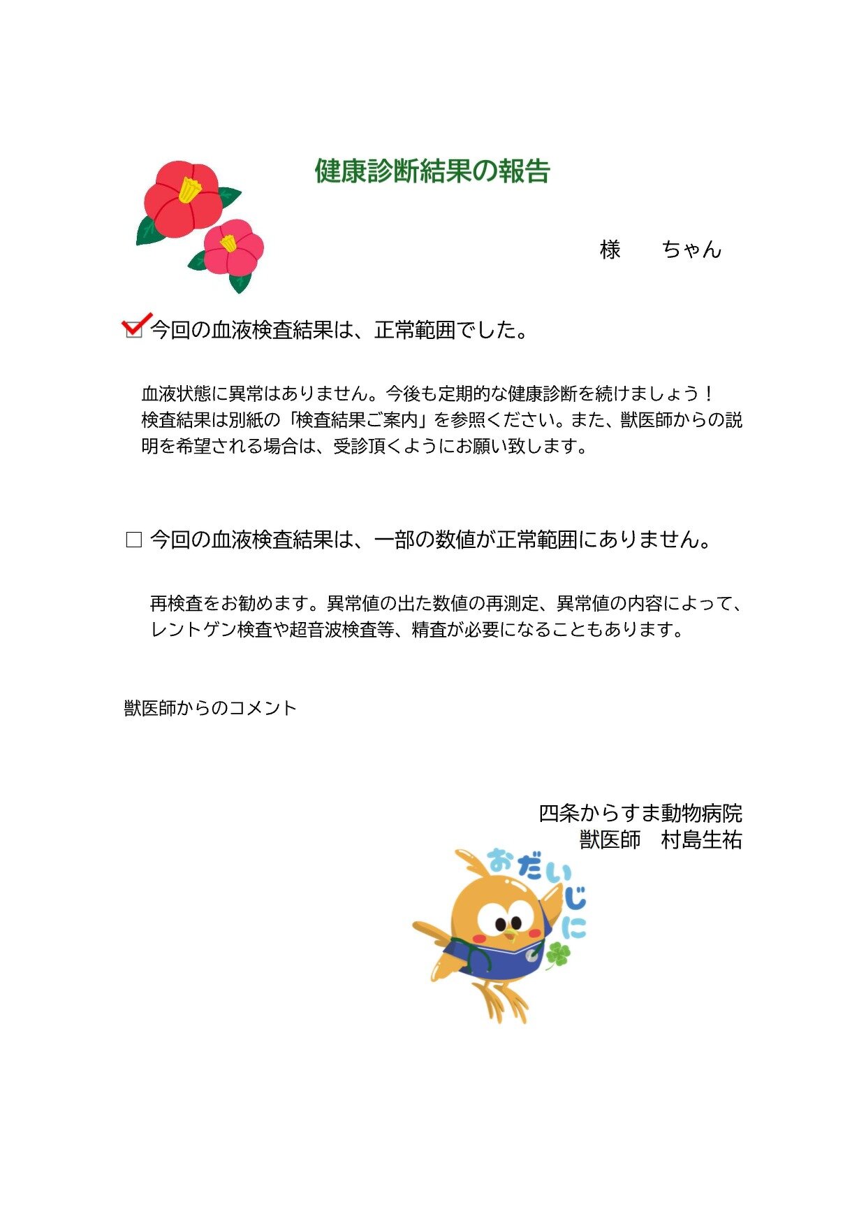春の健康診断ということで、 血液検査をお勧めしています。 検査結果は、 郵送します。 数値を確認して、 コメント付けた形で郵送するのですが、 上の用紙に書き加えています。 ちなみに左上の花のイラストを、 月によって変えています。 4月は、 椿です。