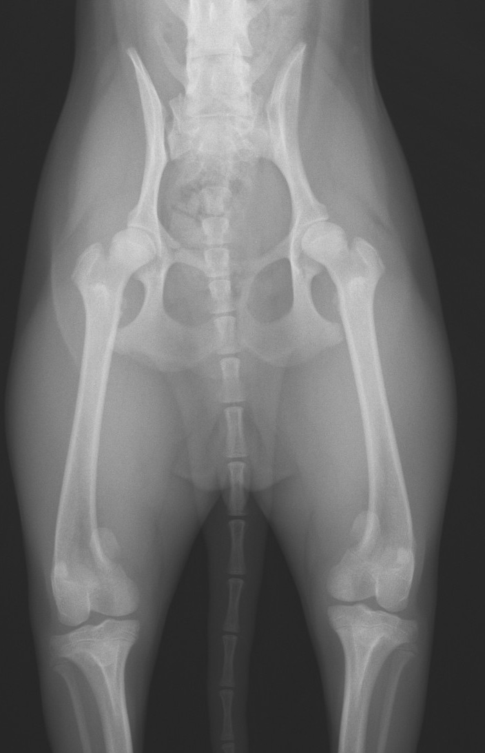 中央に骨盤、そこから大腿骨、脛骨が写っています。